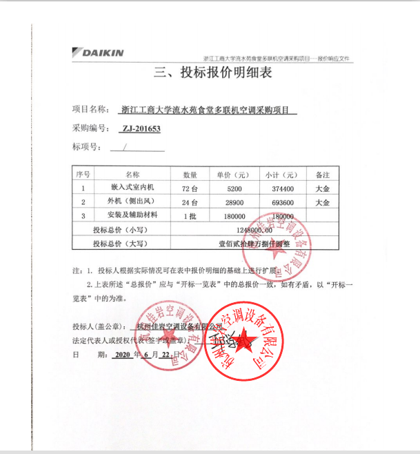 | 1 | 浙江工商大学流水苑食堂多联机空调采购项目 | 详见采购文件 | 1 | 批 | / | / | 1248000元 | 杭州佳岩空调设备有限公司 | 杭州市滨江区滨文路与火炬大道交叉口云杉郡2-1-826 | 91330108682935507J |